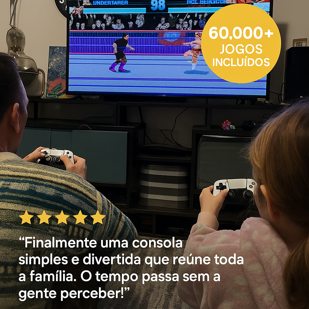 Imagine poder voltar no tempo e redescobrir todos os jogos que marcaram gerações – agora em um único dispositivo. A RetroPro™ não é apenas uma console: é um portal para a nostalgia, trazendo consigo mais de 60.000 jogos lendários, prontos para serem jogados em qualquer tela moderna.